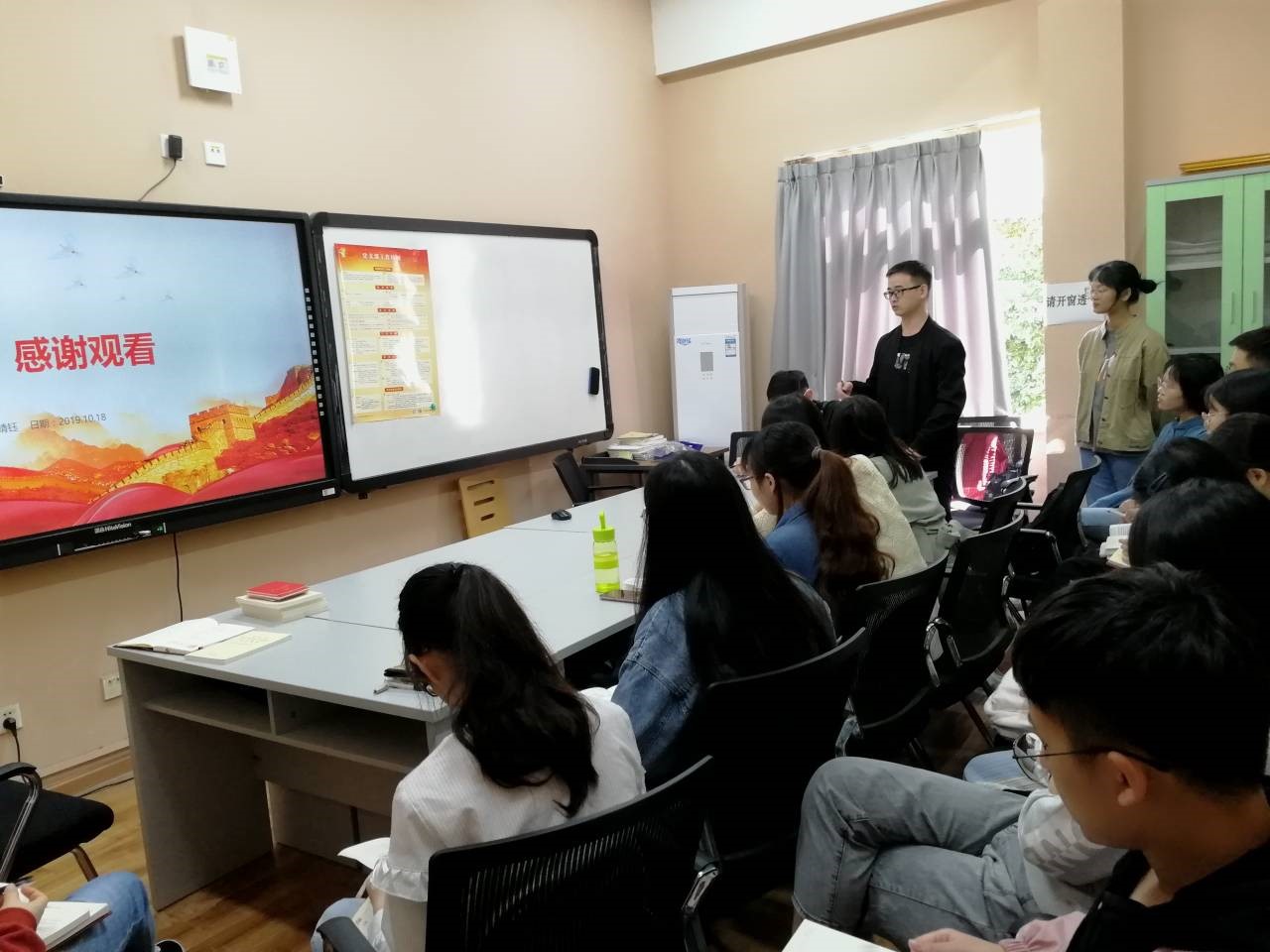 图2.匡悦和杨婧钰同志分享《习近平关于“不忘初心,牢记使命”论文摘编》前三章内容