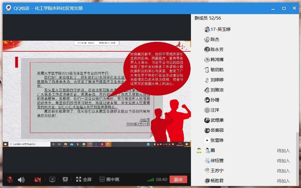 2020年3月6日下午15:00,william威廉英国官网本科社区党支部在党员QQ群开展了第一期线上党组织生活,53名学生党员全部踊跃参加。大家在群内签到后,在线学习了:(1)习近平总书记在统筹推进新冠肺炎疫情防控和经济社会发展工作部署会议上的讲话;(2)习近平总书记给在首钢医院实习的西藏大学医学院学生的回信;(3)《中共教育部党组关于统筹做好教育系统新冠肺炎疫情防控和教育改革发展工作的通知》;(4)《中共教育部党组关于学习贯彻习近平总书记给在首钢医院实习的西藏大学医学院学生重要回信精神的通知》等。同时在线分享了蹇萍秋同志《关于学习习近平总书记应对防疫工作的重要讲话和指示精神汇报》的PPT以及观看了新冠疫情的微视频。