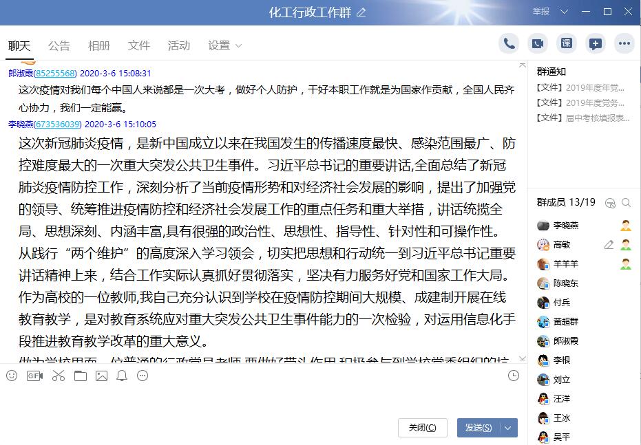 下午3点,学院“化工行政工作群”逐渐热络起来。在高敏老师的主持下,大家结合前期的学习,畅谈自己的学习心得和体会。有的老师说到:“做为学校里面一位普通的行政党员老师,要做好带头作用,积极参与到学校党委组织的抗击疫情工作中,尽一份自己绵薄之力,共迎春天的到来”。有的老师说到:“作为一名普通党员,我们首先要遵守疫情期间相关规定,不给国家添乱;其次,我们要在群众中树立战胜疫情的信心;第三,我们要时刻关注官方报道,学习疫情相关知识,增加对疫情的了解,不胡乱恐慌;第四,我们要学会理性的看待问题,不信谣,不传谣,不添堵;第五,我们要听党指挥,听从指导,干好自己的工作,坚守岗位。”大家纷纷表示,我们要从践行“两个维护”的高度深入学习领会,切实把思想和行动统一到习近平总书记重要讲话精神上来,结合工作实际,认真抓好贯彻落实,坚决有力服务好党和国家工作大局。
