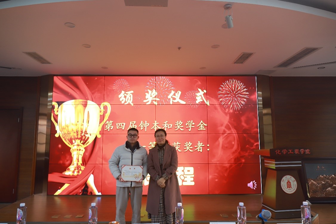 2020级博士研究生张龙程作为获奖学生代表发表感言。他表示“钟本和奖学金”是一份崇高的荣誉,更是一种激励,自己作为新一代的化工学子要正确认识化工、热爱化工,用专业的知识和能力投入到祖国未来的发展建设中去。
