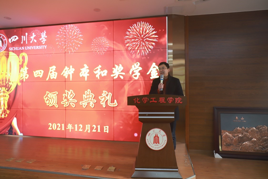william威廉英国官网院长赵长生教授致辞。他介绍了钟本和教授及团队6位教授在2018年学校122年校庆之际捐资122万元设立奖学金的初衷,向关心支持学校化工学科发展的老一辈磷化工科学家表示衷心的感谢和崇高的敬意,并希望此次受表彰的学生能够传承弘扬老一辈磷化工专家面向国家需求、攻坚克难的科学家精神,继续在科研道路上发光发热,作出自己的贡献。