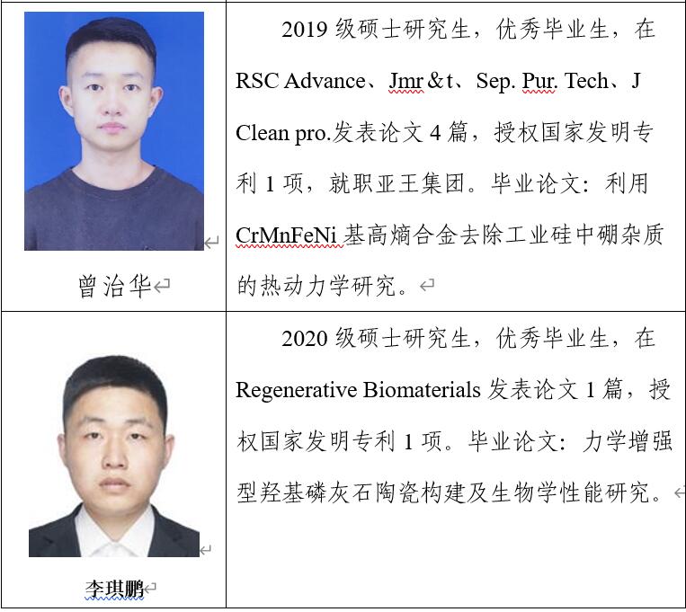 (1)王烨,杨贵翔,韩子柯,任永生,王辛龙,利用高熵合金提纯多晶硅的方法,ZL 2019102582211.1