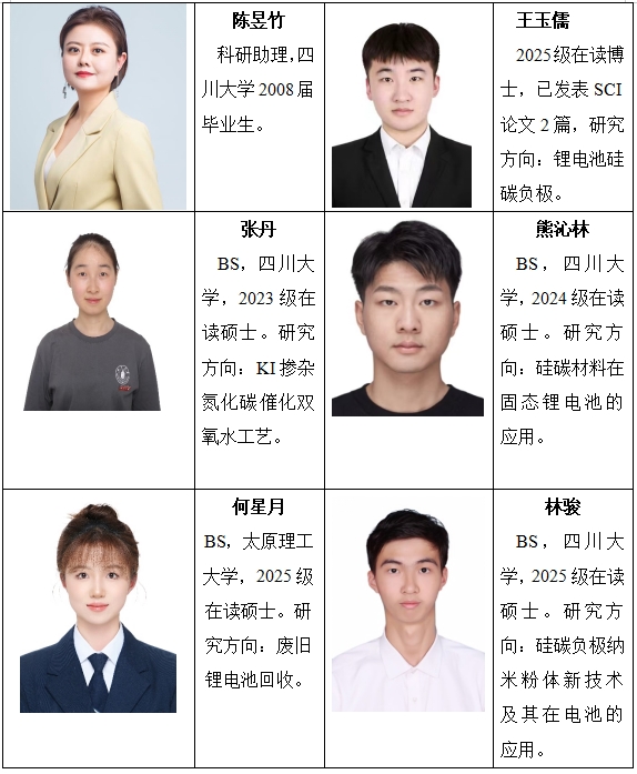 课题组以坚持绿色环保发展和建设新能源新材料美丽世界为教学和科研理念,主要从事于利用冶金法制备新能源材料、太阳能级多晶硅造渣精炼、稀有金属的分离提纯及废弃物循环利用回收等领域的研究,迄今在Carbon, ACS Applied Materials and Interfaces, Inorganic Chemistry, Journal of Cleaner Production, Industrial Engineering Chemical Research, Hydrometallurgy, Solar Energy and Solar Cells, Metallurgical and Material Transaction B等国际国内高水平学术期刊及学术会议上发表论文40余篇,授权中国发明专利8项,项目经费400余万。