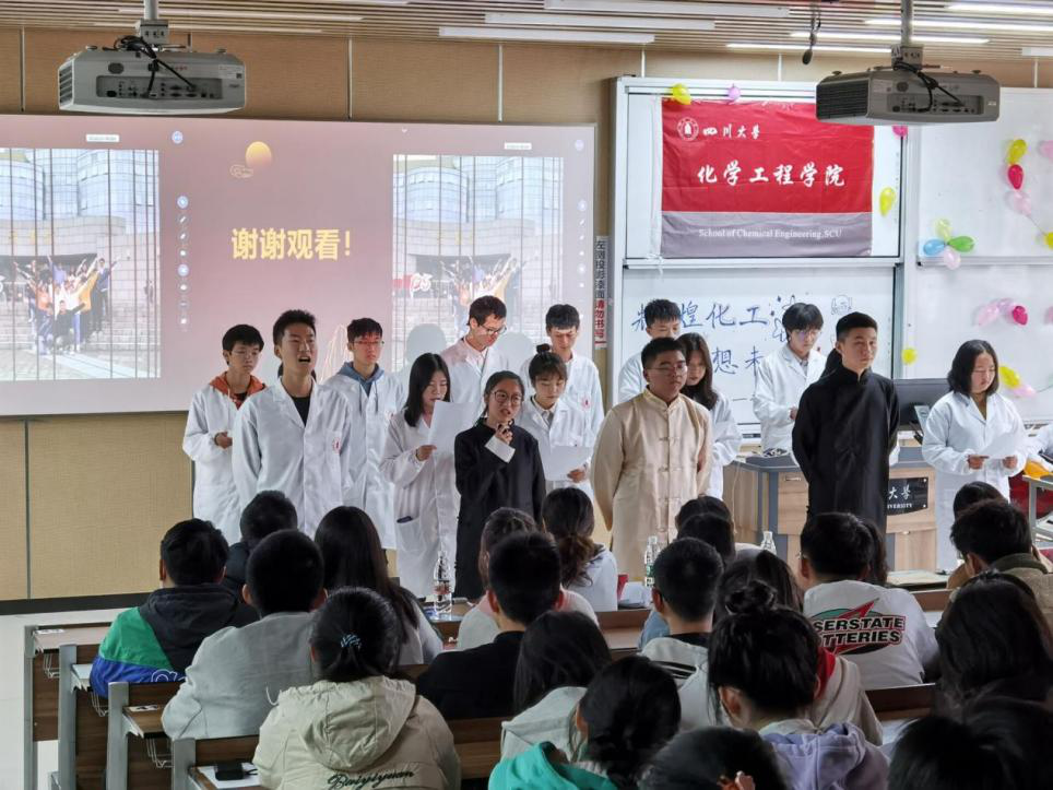 互联1班的同学们改编了周杰伦的歌曲《稻香》,歌词活灵活现了川大化工新生的学习生活,让在场的观众深有同感!并且同学们以独唱与合唱结合,也偶尔来一段rap,气氛轻松活跃,将遇到的困难都付诸笑颜,表达了他们对于困难的淡然和对化工的执着!