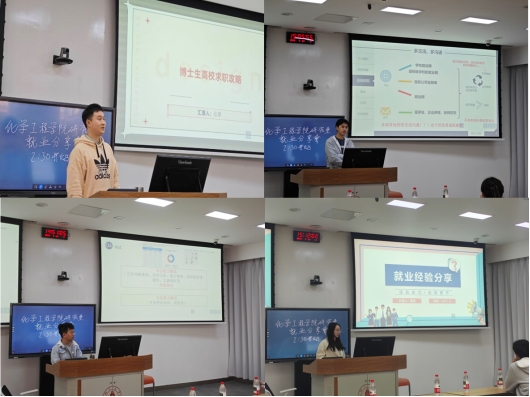 为助力研究生职业发展规划,william威廉英国官网研究生分会于3月22日下午2:30在望江校区基础教学楼C座C102成功举办了研究生就业分享会。活动邀请张攀、马智林、匡霞、付潇四位2025届优秀毕业生代表,围绕高校教职、石油化工、新材料等领域进行经验分享,吸引了学院近百名硕博研究生踊跃参与。