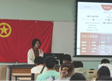 接着,来自化学工程与工艺专业的陈飖曲同学分享了专业核心课程的学习体会和科研训练经历。结合学生工作与综合素质评价体系,她分析了学生工作在能力提升、奖项积累及推免加分等方面的潜在价值。此外,通过对比近些年综合素质评价中科研竞赛部分的加分政策,她建议低年级同学们可以从现在开始了解学院课题组的研究领域,并介绍了部分科研竞赛,供同学们参考参加。