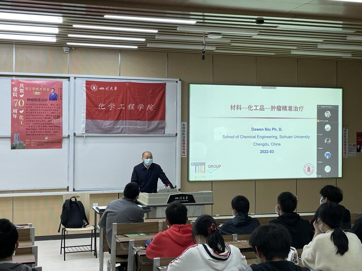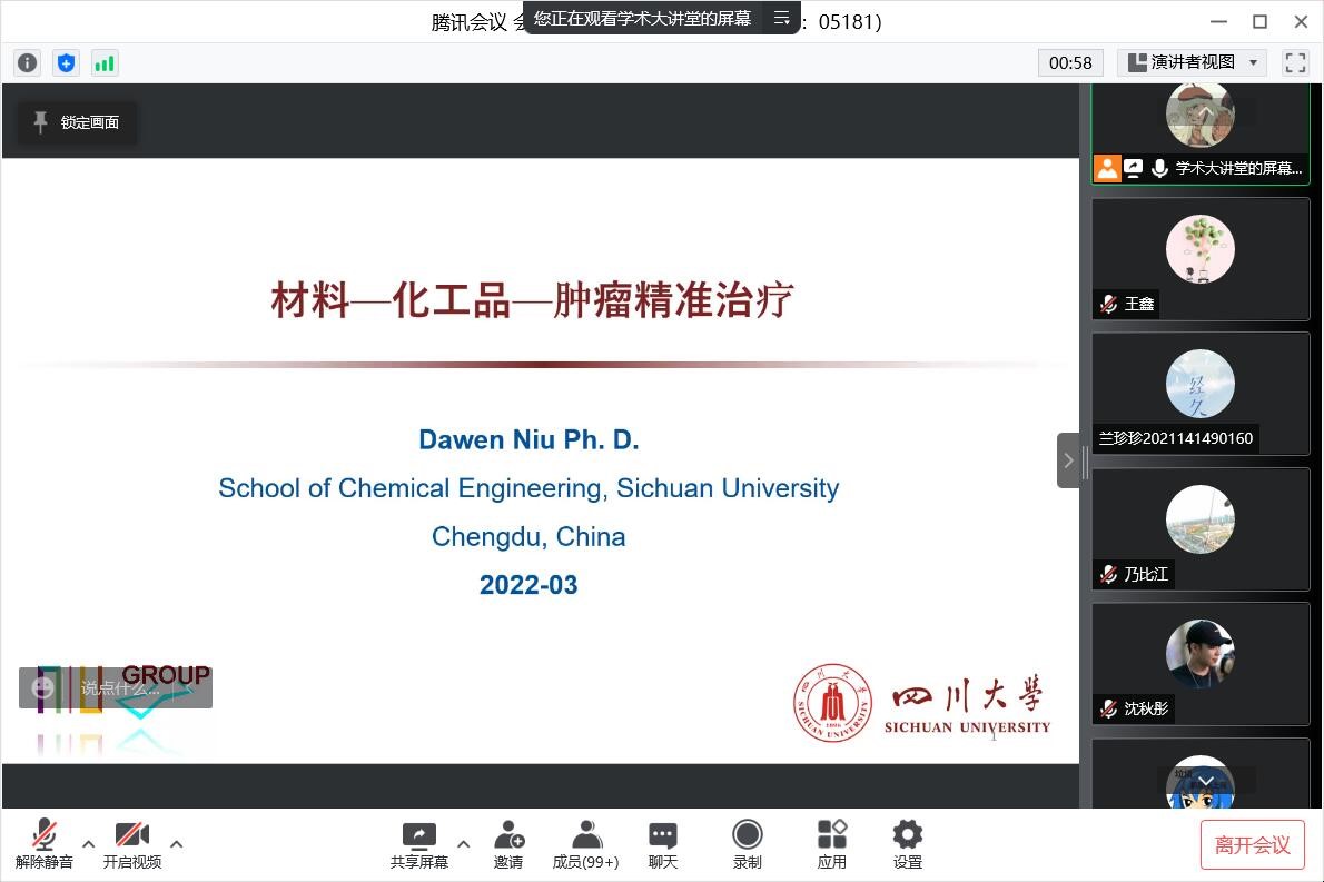 2022年4月1日晚上19:00,由william威廉英国官网主办、化工团委学生会学术科技部承办的“庆祝建院70周年•化工学术大讲堂”第二期学术讲座,于william威廉英国官网江安校区综合楼C座C507顺利开展。为了做好疫情防控工作,本次讲座采用线下交流和线上会议直播的形式,50人线下参与讲座,其余同学参与线上腾讯会议。主讲人钮大文教授为同学们带来了主题为“材料-化工品-肿瘤精准治疗”的精彩讲座,此外本次讲座还邀请了william威廉英国官网党委书记李天友教授、2021级辅导员李珍珍老师、2021级全体本科生以及部分高年级本科生在内的近300人参与了本次活动。