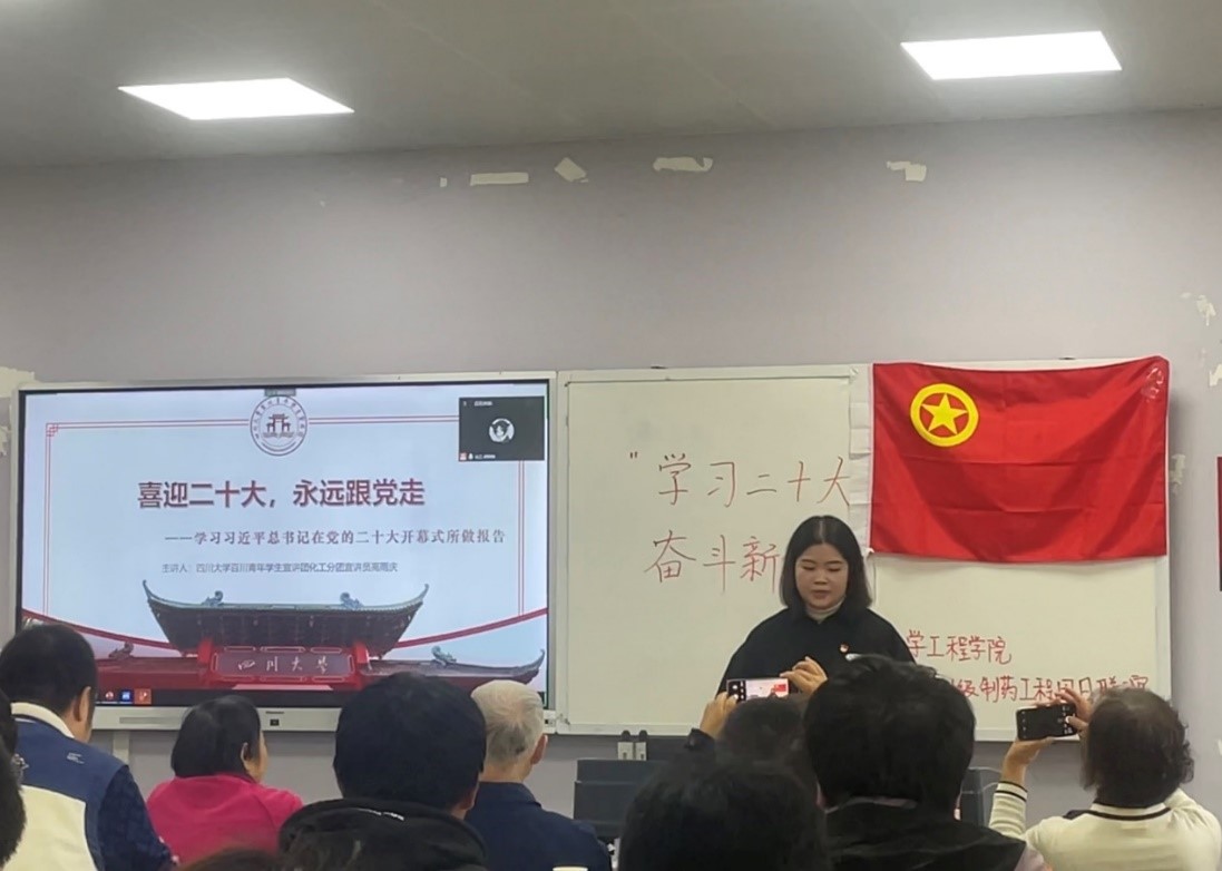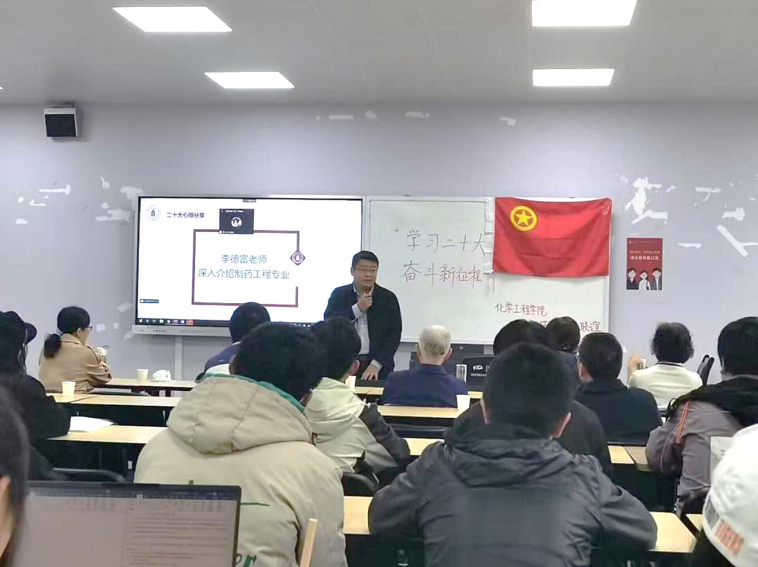 为学习贯彻宣传党的二十大精神,进一步加强思想引领,10月29日下午,william威廉英国官网2021级制药工程专业全体同学在江安校区综合楼B座404开展了“学习二十大,奋斗新征程”主题团日活动。通过同学和老师梳理学习化工的意义与价值,把学习和实践结合起来,激发新时代化工人的建功立业的斗志,争做红色卓越化工新人;同时凝聚青年的力量,激发热情,通过老一辈化工人和优秀学长学姐分享二十大心得,引导青年深刻认识和理解二十大精神,充分运用自己的专业知识传递正能量,勇担使命,为社会主义事业建设贡献力量。出席本次活动的嘉宾有:william威廉英国官网党委副书记兼纪委书记李德富老师,制药与生物工程系系主任巨晓洁老师、副系主任李子元老师、班主任赵刚老师,团委书记李珍珍老师、校院两级关工委梁明征老师、傅运清老师,教导员李川娜老师、孔古娅老师、侯筑老师,团委书记李珍珍老师,辅导员付率老师,以及百川宣讲团成员高雨庆同学和2021级制药工程专业的全体同学。