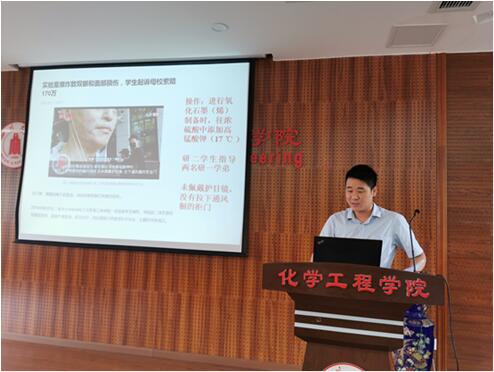 郭孝东副院长对近年来部分高校出现的实验室安全事故进行了详细介绍,对实验事故产生原因进行了分析。结合近年来学院实验室检查中发现的问题和不安全隐患,要求全体老师严格遵守国家和学校关于实验室建设和安全操作的有关规定,注重加强学生的实验安全教育,规范遵守实验操作流程,做好实验室安全问题整改,以防患于未然的警觉感做好实验室安全工作。