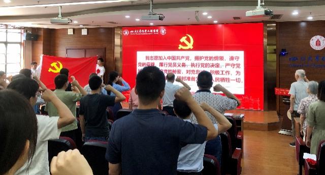 由梁明征老师领誓,会上还进行了新党员入党宣誓、党员重温入党誓词。