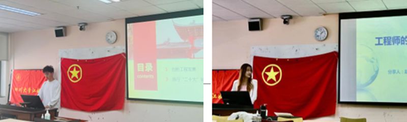 互联化工1班团支部书记邱天和工业工程(国际合作)第二团支部副团支书赵璘睿同学围绕两团支部专业的相似性与共通性,聚焦各自专业特色,以“创新工程发展,争做时代新人”为话题展开分享。邱天同学分享说:“互联化工是新工科改革背景下的工科专业,致力于培养信息+交叉复合型人才,并且作为江姐班,我们要做好红色传承和賡续的典范,将以江姐精神为重点的红色基因不断传承下去。”赵璘睿同学分享说:“工业工程专业承担着国际合作的重任,致力于打造宽广国际化视野、能适应国际化竞争环境的优秀工程师。