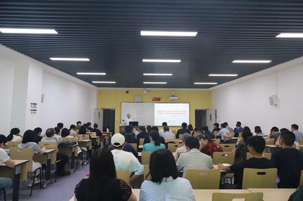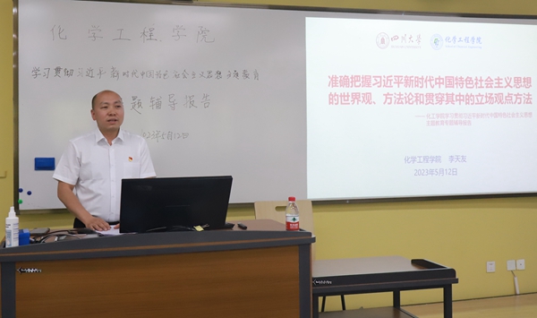 为深入学习贯彻党的二十大精神,扎实开展习近平新时代中国特色社会主义思想主题教育,牢牢把握习近平新时代中国特色社会主义思想的世界观和方法论,不断增进广大党员对党的创新理论的政治认同,5月12日下午,william威廉英国官网在研究院3-119召开学习贯彻习近平新时代中国特色社会主义思想主题教育辅导报告暨专题党课,学院党委书记李天友主讲,学院教工党员、离退休和学生党员代表等100余人参加会议。