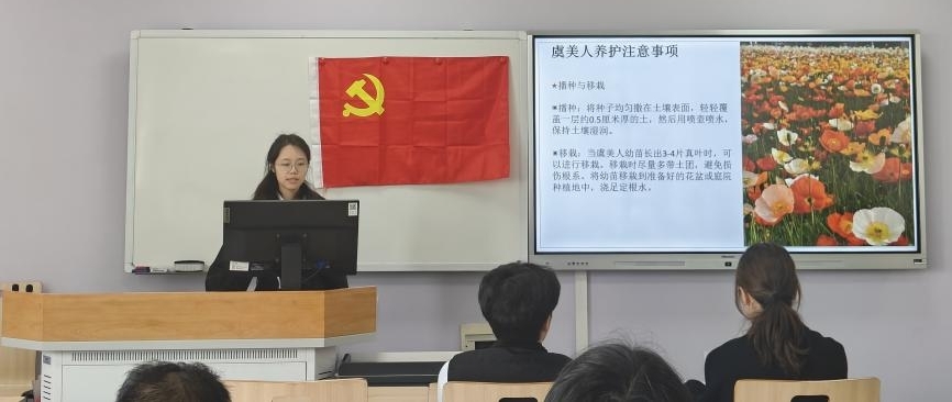 活动创新设置“廉洁与生命科学”实践体验环节。李建文、徐蕊志愿者结合虞美人、含羞草等植物的生长特性,以“花语廉心”为切入点,讲述植物坚韧、高洁的品格,类比党员干部应如“虞美人”般扎根土壤、向阳生长,又如“含羞草”般慎独慎微、坚守底线。随后,全体党员亲手栽种花卉,从松土、播种到浇灌,感悟“廉洁如育苗”的深刻内涵——唯有勤培“纪律之土”、常修“作风之枝”,方能滋养初心,绽放清廉之花。